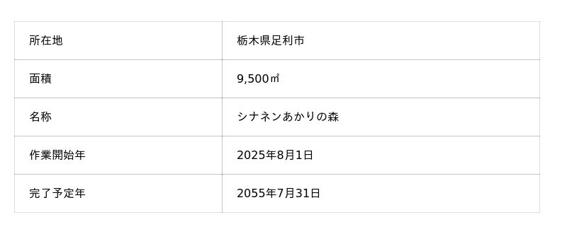 エネルギー・住まい・暮らしの総合サービス事業を提供するシナネンホールディングス株式会社(本社:東京都品川区、代表取締役社長:中込 太郎)の子会社で、エネルギーソリューションを提供するシナネン株式会社(本社:東京都品川区、代表取締役社長:小松良則)は、「シナネンあかりの森プロジェクト」の一環として、青葉組株式会社(本社:東京都千代田区、代表取締役:中井照大郎)と「自然資本共創プログラムaoba」の契約を締結し、青葉組が管理する栃木県足利市の土地(9,500平方メートル )を「シナネンあかりの森」とし、自然資本を育む森づくりへの支援を開始したことをお知らせいたします。