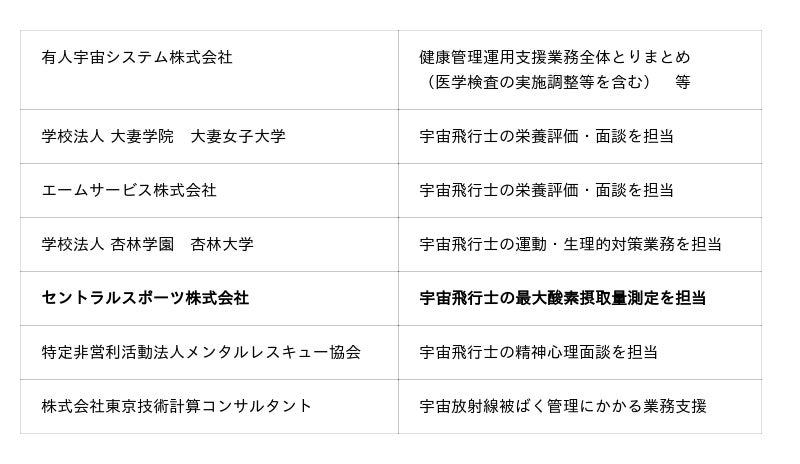 本業務は、2025年4月から2031年3月までの6年間にわたり、JAXAの委託を受けて有人宇宙システム株式会社(JAMSS)が実施企業として運用を担っています。JAMSSは、各分野の専門機関と連携しながら、健康管理運用業務全体を統括しており、セントラルスポーツもJAMSSの全体統括の下、宇宙飛行士の最大酸素摂取量測定を行っております。