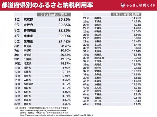 主要23サイトを横断比較できる「ふるさと納税ガイド」は、都道府県別の「ふるさと納税の利用者数」「ふるさと納税の利用率」「ふるさと納税の平均寄附金額」について算出した結果について発表します。