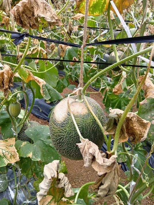 今年のメロンの被害は17aのハウス全体で、ミツバチの受粉不良と高温障害での日焼け他で、収穫量が例年の3分の1で被害額がとても大きく、限られた数しか販売出来なかった。