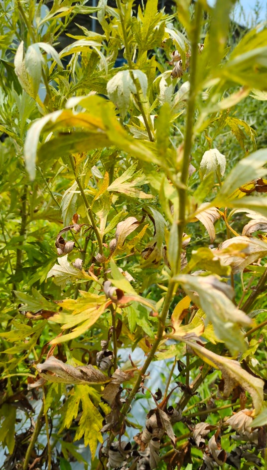 高温・雨不足でよもぎの生育に被害あり。よもぎは雨が降る程度の量で生育はするが、今年は雨が大変少なく、影響もある。また、高温で葉が焼け、枯れる被害が出ている。秋頃に花をつけるが、異常気象のせいで6月に花をつける。花をつけると葉が小さくなり、茎(軸)部分が太くなることにより品質も下がる。昨年までは収穫時期が9月後半頃までだったが、今年は大変短くなり収穫量が大幅に減っている。