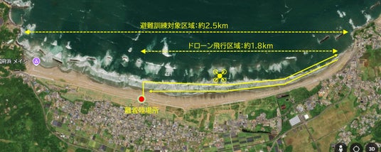 今回の訓練においてブルーイノベーションは、「BEPポート|防災システム」を活用し、海岸線約1.8kmを、飛行速度約8m/s、高度約28mで自動飛行させたドローンにより、上空からの音声広報と避難誘導を実施しました。これにより、海水浴客やサーファー、漁業者に対して迅速かつ広域的な警報伝達を行い、災害発生時における情報伝達の有効性を検証しました。