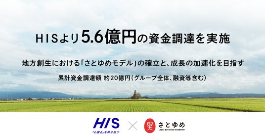 全国50 エリア以上で地方創生事業のプロデュースを行う株式会社さとゆめ(本社:東京都千代田区、代表取締役CEO:嶋田 俊平、以下「さとゆめ」)は、株式会社エイチ・アイ・エス (本社:東京都港区、代表取締役社⾧:矢田 素史、以下「HIS」)を引受先とした第三者割当増資等により、5.6 億円の資金調達を実施しました。今回の調達で、さとゆめ及び子会社・関連会社での累計資金調達額は、デット及びエクイティを合わせて、約20 億円に達します。