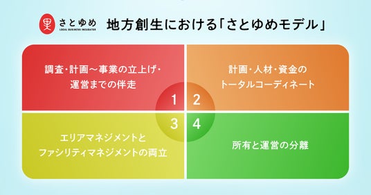 さとゆめは、コーポレートミッション「ふるさとの夢をかたちに」を、全国のより多くの地域で実現するため、以下の4 つの要素を組み合わせた、さとゆめならではの地方創生モデル「さとゆめモデル」の確立を進めています。今回調達した資金を活用し、HIS との連携を生かしながらこのモデルを完成させ、全国約1700 の地方自治体での伴走型コンサルティング及び、地域事業開発を加速してまいります。