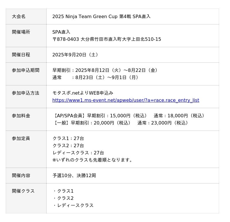 株式会社カワサキモータースジャパン(本社:兵庫県明石市、代表取締役社長:佐伯 健児)は、2025 Ninja Team Green Cup 第4戦 SPA直入 のエントリー受付がまもなく開始されることをお知らせいたします。