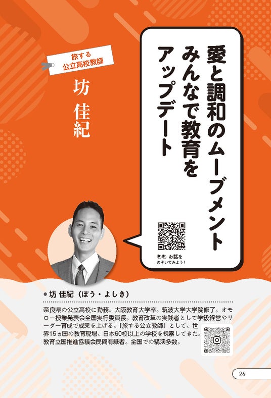 坊 佳紀(ぼう・よしき)奈良県の公立高校に勤務。大阪教育大学卒。筑波大学大学院修了。オモロー授業発表会全国実行委員長。教育改革の実践者として学級経営やリーダー育成で成果を上げる。「旅する公立教師」として、世界15ヵ国の教育現場、日本60校以上の学校を視察してきた。教育立国推進協議会民間有識者。全国での講演多数。