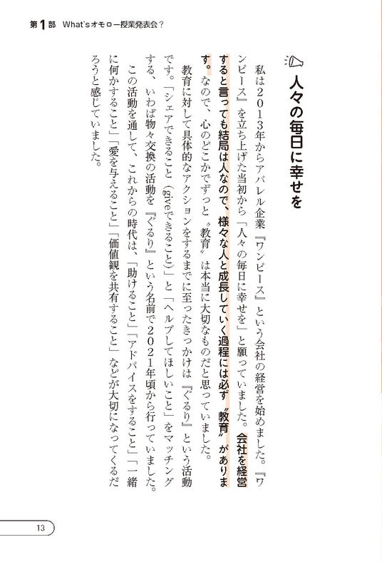 第1部では、発起人の立ち上げまでの経緯や思い、なぜ市民が主役なのか、現場の先生にどんな影響があるかなど、「オモロー授業発表会」の展望について詳しく書かれています。