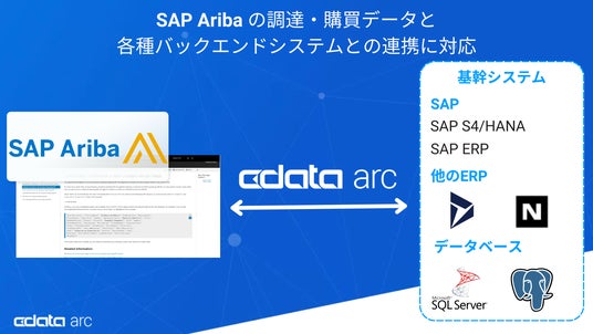 電子調達・購買管理サービスであるSAP Ariba 向けのドライバー『CData Drivers for SAP Ariba』がCData Arc でも利用可能になりました。SAP Ariba を活用する上で、調達・購買データとマスターデータを持つバックエンドシステムとの連携は欠かせません。CData Arc なら、SAP Ariba の調達・購買データをノーコードでSAP ERP、SAP S/4HANA、Dynamics 365、NetSuite、SQL Server、PostgreSQL などのERP およびDB と連携できます。