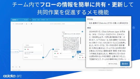 2024年8月1日、CData Software Japan 合同会社(本社:アメリカノースカロライナ州、日本オフィス:宮城県仙台市、代表社員 職務執行者:疋田 圭介、以下CData)は、B2B 連携ツール『CData Arc V24.2』をリリースしました。本アップデートリリースでは、チームでのフロー作成・管理を円滑にするメモ機能、フラットファイルでのマルチバイト対応をはじめとした機能強化を行っています。また、SAP Ariba のドライバーを使うことでCData Arc でSAP Ariba と基幹システム間の連携がノーコードで実現できます。CData Arc は、エンタープライズからSME までのファイル・データベース・ストレージ・SaaS にまたがるB2B 連携をサポートするために、たゆまぬ機能強化を行っています。