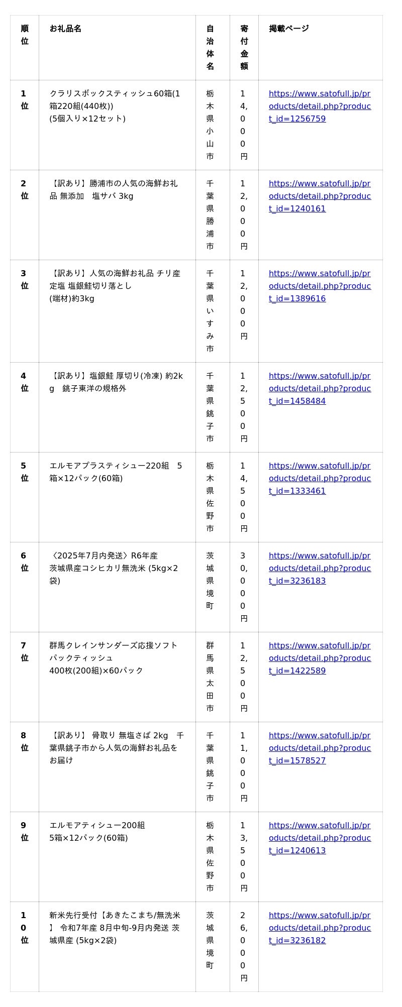 「クラリスボックスティッシュ」が2024年の関東版年間ランキングに続いて今回も1位を獲得し、5位、7位、9位にも「ティッシュ」がランクインしたことから、TOP10のうち4件を「ティッシュ」が占める結果となりました。2023年頃から、物価高騰や生活コスト上昇を背景に日用品をお礼品として選ぶ人が増え、日常的に使用する実用性の高いお礼品がランキング上位の常連として定着しつつあります。その他、2位、3位、4位、8位には日常的に使用しやすい「鮭・サバ」がランクイン。6位、10位には「米」がランクインし、昨年から続く米不足や価格高騰の影響を受け、多くの寄付者がふるさと納税を活用して「米」を求めていたことが分かる結果となりました。