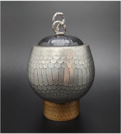 新潟県三条市にて金工作家として活動しています。 本作は、32年間の鎚起銅器職人としての技術をもとに、干支の巳をテーマに制作しました。摘みは純銀を叩いて成形し、目には18金をろう付け。蓋は黒味銅に透かし模様、胴は銅に錫を塗り、脚は真鍮を使用しています。全体に蛇柄の鎚目を施しつつ、色味と素材の調和に配慮しました。 近年は、伝統技法を生かしながら革新的な作品づくりに挑戦しています。今後も独自の表現を追求し、工芸に携わる方々に刺激を与えられる存在を目指してまいります。このたびは誠にありがとうございました。
