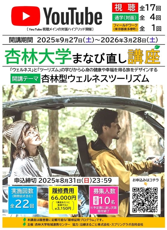 杏林大学(東京都三鷹市、学長 渡邊卓)は、「ウェルネス」と「ツーリズム」の視点から、心身の健康と幸福を育む旅について学ぶ、社会人向け講座『杏林型ウェルネスツーリズム』(まなび直し講座2025)を2025年9月より開講します。