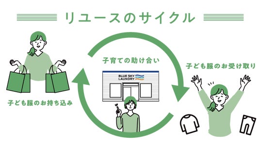 ブルースカイランドリーでは、不要になった子ども服を回収し、必要な家庭にお譲りするリユース活動を行っています。店舗にリユースブースを設置することで地域での助け合いや目には見えない絆を育み、ラックから衣類だけでなく想いも受け取れるような、育児への励みとなる“地域コミュニティの場”を提供することを目指しています。
