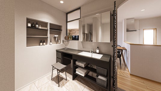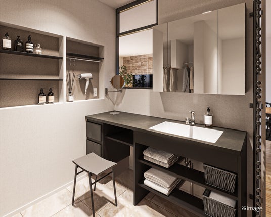 「贅沢な自分時間」を叶える快適パウダールームパウダールームは、広々としたカウンター付きで、座ってじっくりとスキンケアやメイクができる贅沢な空間です。ニッチ収納、タオルウォーマー、ドライヤーホルダーなども完備し、快適性と時短を両立させました。日々のストレスを忘れ、自分自身と向き合うための大切な場所となります。