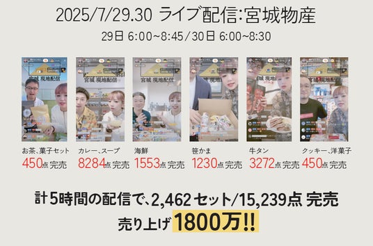 こうした課題解決を目指して始まったのが『地方再生プロジェクト』です。これまでの福岡・山口(第1弾)、宮城(第2弾)では、配信中に全商品が完売するなど大きな反響があり、特に宮城開催ではわずか2日間/配信5時間で1,800万円以上の売上を記録しました。ライブコマースが地方産品の新たな販路として強い可能性を持つことを実証しています。