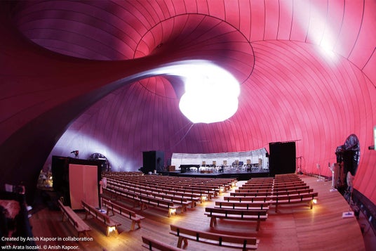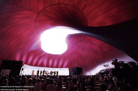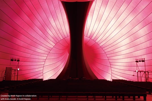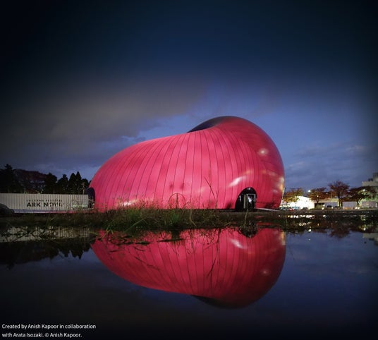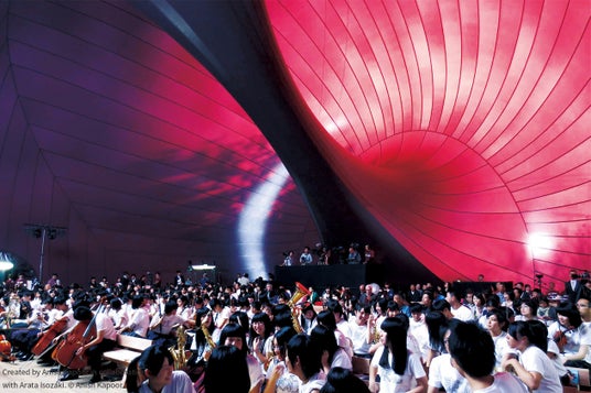 美しい茄子色、『心臓』をイメージしたフォルムは、世界的な建築家・磯崎新氏とインド出身のイギリス人彫刻家アニッシュ・カプーア氏が協働して生まれたデザインです。この設計をもとに、当社の関連会社である太陽工業のテクノロジーによって独特なデザインを実現しました。
