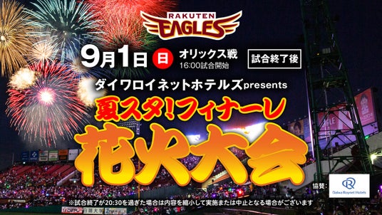 株式会社楽天野球団(本社:宮城県仙台市宮城野区、代表取締役社長:森井 誠之)は、9月1日(日)オリックス・バファローズ戦の試合終了後に開催する『ダイワロイネットホテルズpresents 夏スタ! フィナーレ花火大会』のスペシャルゲストにMONKEY MAJIKさんが登場することとなりましたので、お知らせいたします。