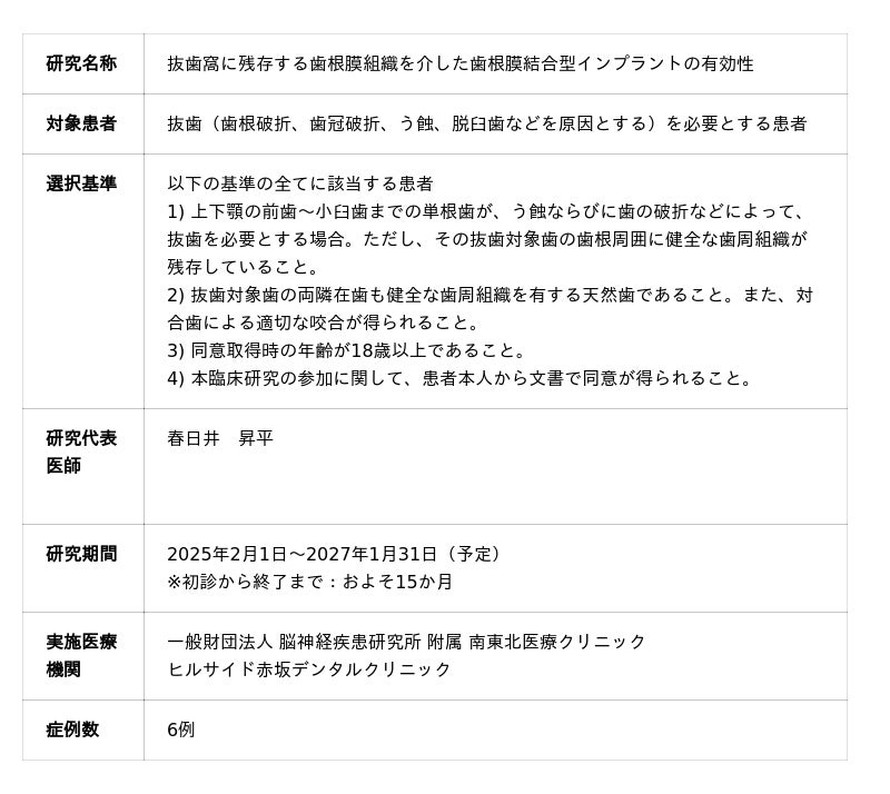 弊社が世界に先駆けて取り組んでいる次世代バイオインプラントの研究開発では、2025年2月から福島県郡山市の一般財団法人脳神経疾患研究所(南東北医療クリニック)(所在地:福島県郡山市、グループ総長:渡邉一夫、理事長:渡邉貞義、統括病院長:紺野愼一、クリニック所長:黒田直人)歯科、顎顔面インプラントセンター(センター長:春日井昇平、東京科学大学名誉教授、元東京医科歯科大学大学院医歯学研究科インプラント口腔再生医学分野、教授)にて、「抜歯窩に残存する歯根膜組織を介した歯根膜結合型インプラントの有効性及び安全性評価試験」が進められています。