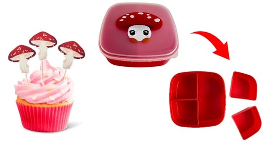 持ち寄ったフードにきのこをさしてかわいさを演出。コンテナは仕切りがうれしい!