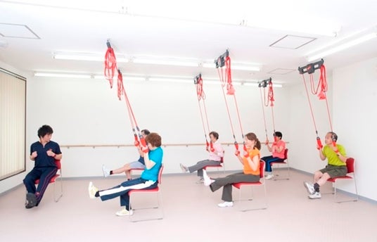 運動指導員は、「レッドコード」というスリングを使用したバランストレーニングや関節に優しい空気圧のマシン等による運動、口腔嚥下機能向上プログラム等を提供し、身体機能を改善していきます。また、当社が独自に開発した脳活性化プログラム「シナプソロジー(R)」は、身体を動かしながら、脳を活性化させることで、転倒予防や認知機能の向上を図ります。