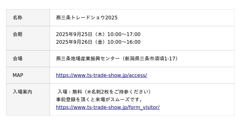 燕商工会議所および三条商工会議所を中心とする燕三条トレードショウ実行委員会は、2025年9月25日(木)・26日(金)の2日間、燕三条地場産業振興センターにて今年、第9回となる「燕三条トレードショウ2025」を開催いたします。