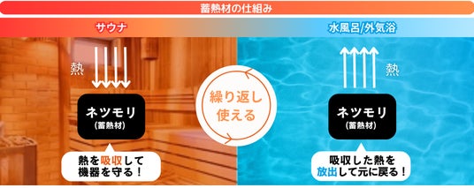 サウナ浴中に蓄熱パックが吸収した熱は、サウナから出て水風呂や外気浴中に自動的に放熱されるため、何度も繰り返し使用可能です。