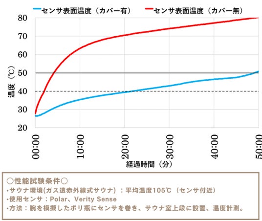 ウェアラブル端末を100℃のサウナの熱から守るサウナの熱を吸収する蓄熱パックが入ったカバーで覆うことで、ウェアラブル端末への伝熱を抑制。100℃のサウナで最大20分間、端末表面温度を40℃以下に保てることを確認済みです。