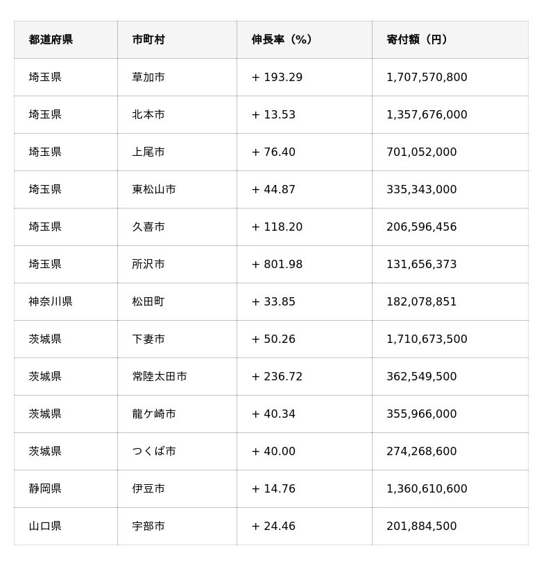 LOCUS BRiDGE令和6年度一括代行業務支援自治体の成果一覧(伸長率/寄付額)