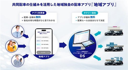 アプリ上で事業者横断の共同配車が可能となり、エリア内で最適な車両を効率的に手配。これによ