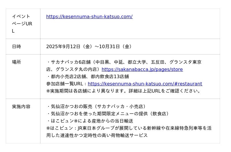 また、注目いただきたいのは、新幹線輸送を活用した鮮魚店「sakana bacca」での特別販売です。朝水揚げされたばかりのかつおをその日のうちに東京まで運び販売します。通常市場経由で流通しているものより約1日早く消費者にお届けでき、これは気仙沼で食べられているかつおと同じ鮮度。東京にいながら、まるで現地で食べるような最高のおいしさを体験していただけるはずです。