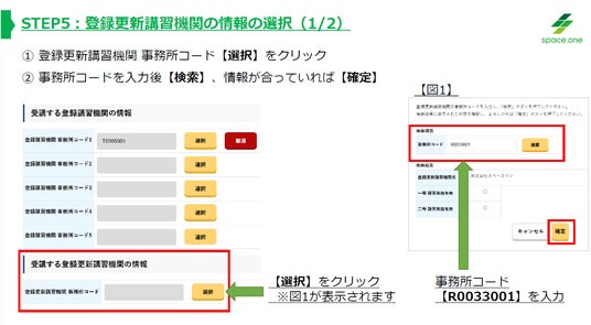 受講したいスクールの「事務所コード」を選択していただきます。全部で7つのステップとなっており、弊社では手順をわかりやすくまとめたマニュアルを見ながら進めることが出来ます。