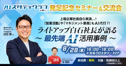 そして、今回なんとAIスタディクラブ発足を記念して、株式会社ライトアップ代表の白石様をゲストにお招きし、8/28(木)16:00~18:00に【取締役以上/先着40名様限定】で発足記念イベントを実施することが決定しました!