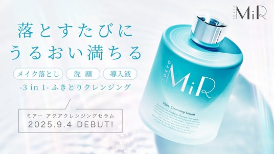 株式会社MiR(本社:東京都中央区、代表取締役:熊谷 真理)は、メイク落とし・洗顔・導入液の3役を1本でこなす拭き取りタイプの「MiR(ミアー)アクアクレンジングセラム」(250mL/税込3,280円)を9月4日(木)より販売開始いたします。発売に先立ち、8月20日(水)よりAmazonにて予約受付を開始いたしました。洗い流し不要で、忙しい日々を送る女性の時短と本格的なうるおいケアを両立する、新しいスキンケア体験を提供します。無添加&非イオン処方、リラックスタイムにぴったりの爽やかな柑橘とハーブの香りです。