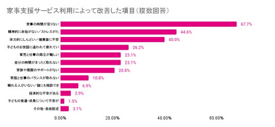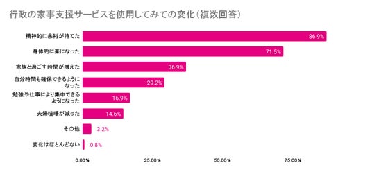 とくに「精神的に余裕が持てた」(86.9%)、「身体的に楽になった」(71.5%)という回答が目立ち、家事支援が単なる作業の代行ではなく、“暮らしの回復”をもたらしていることが浮かび上がります。