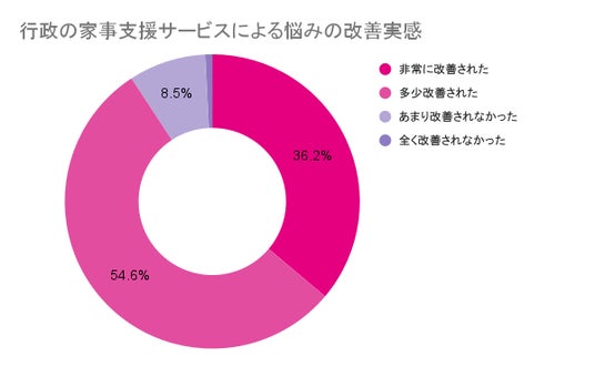 実際に制度利用後には、行政の家事支援サービスにより悩みが改善した人は90.8%にのぼり、「家事時間が改善した」67.7%、「ストレスが軽減した」44.6%といったポジティブな変化が報告されています。