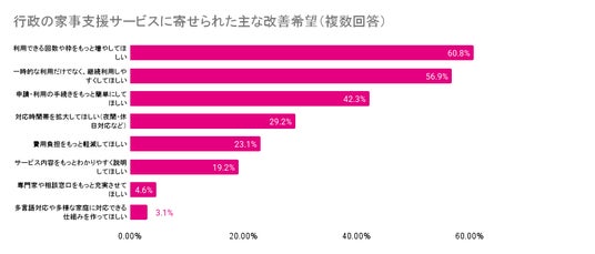 さらに利用者の多くが「利用枠の拡大」「継続利用の仕組み化」「申請手続きの簡素化」を望んでおり、96.2%が今後も家事支援サービスの利用意向があると回答しました。家事代行が“一時的なサービス”ではなく、“持続可能な暮らしのインフラ”として根づきつつあることが読み取れます。