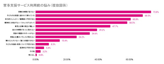 調査では、「家事の時間が足りない」73.8%、「子どものお世話に追われて疲れている」68.5%、「体力的にしんどい/健康面に不安がある」60.8%、「精神的に余裕がない」58.5%、「育児と仕事の両立が難しい」47.7%など、切実な悩みが浮かびました。