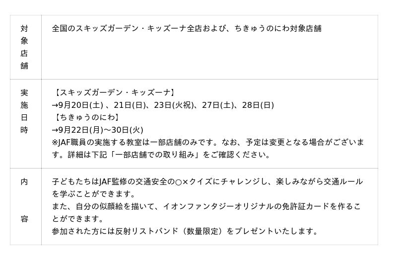 そしてこのたび、子どもたちやそのご家族に交通安全の重要性を広く伝えていくために、JAFと株式会社イオンファンタジーが連携し、交通安全教室を実施することとなりました。