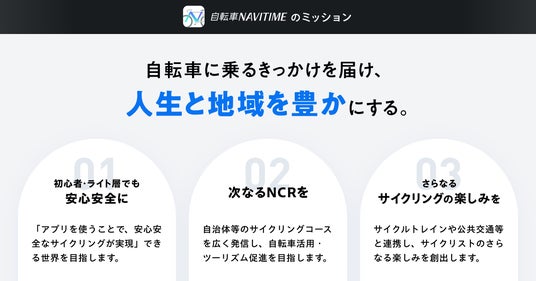 ナビタイムジャパンは今後も、地域との連携を図り、サイクリングに関する情報を拡充させることで、利用者のより楽しく快適なサイクリングをサポートするとともに、地域の自転車施策に『自転車NAVITIME』をお役立ていただくことで、サイクルツーリズムを通じた観光振興や周遊促進に貢献してまいります。