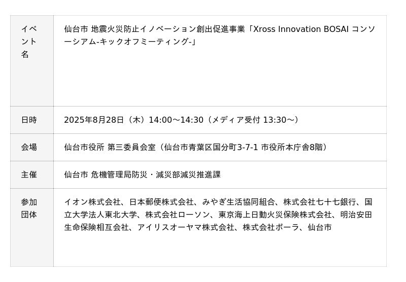 8月28日には、本取り組みの共創意思を対外的に示すキックオフイベントを仙台市役所にて開催。仙台市と包括連携協定を結ぶ事業者10者の代表も出席し、メディア向けの囲み取材や記念撮影も予定しています。