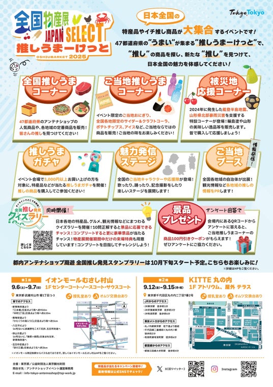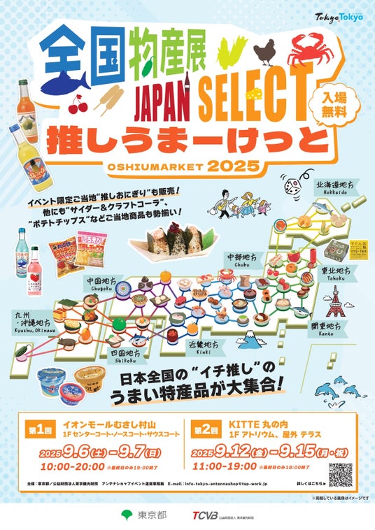 東京都及び公益財団法人 東京観光財団が主催し、第1回は2025年9月6日(土)~7日(日)の2日間、イオンモールむさし村山、第2回は、9月12日(金)~15日(月・祝)の4日間、KITTE丸の内にて開催いたします。本イベントは、全国のアンテナショップ等と連携し、日本全国の“イチ推し”の美味しい特産品を集め、食を通じて47都道府県の魅力を感じていただき、来場者皆様の“推し”を見つけていただくイベントです。