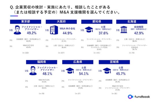 買収検討状況について「買収を検討している」と回答した割合が特に多かった東京都・大阪府・福岡県では、ファイナンシャル・アドバイザーやM&A仲介会社といったM&A支援を主に行っている支援機関を選ぶ傾向があることがあることがわかります。