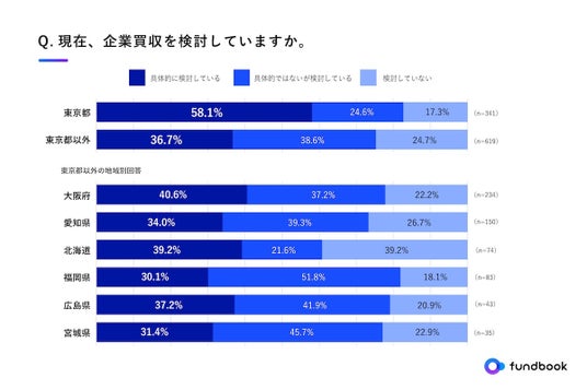 1)東京都は半数以上の買手企業が買収を具体的に検討、地方は4割未満にとどまる2)地域によって買収予算規模の傾向に違いがみられる