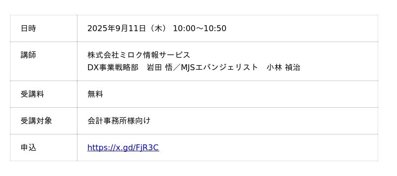 財務・会計システムおよび経営情報サービスを開発・販売する株式会社ミロク情報サービス(本社:東京都新宿区、代表取締役社長:是枝周樹、以下「MJS」)は毎月、財務や経営の専門家による、経理や財務の実務研修から、税理士会認定研修、システム研修まで多彩なセミナー研修会を実施しています。詳細情報は、MJSコーポレートサイト(https://www.mjs.co.jp/seminar.html)をご参照ください。