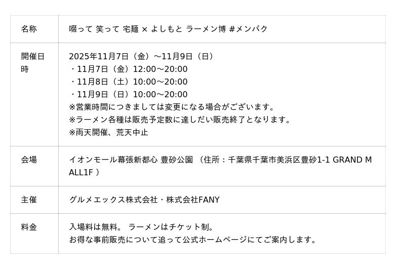 国内最大級のラーメン専門通販サイト「宅麺.com」を運営するグルメエックス株式会社(本社:東京都港区、代表取締役社長:冨澤 文秀)は、吉本興業グループの株式会社FANY(本社:東京都新宿区、代表取締役社長:梁 弘一)と共同で、11月7日(金)よりラーメンイベント「啜って 笑って 宅麺 × よしもと ラーメン博 #メンパク」を開催します。日本が世界に誇るトップコンテンツの「ラーメン」と「お笑い」がタッグを組んだ、おいしくて笑える3日間です。