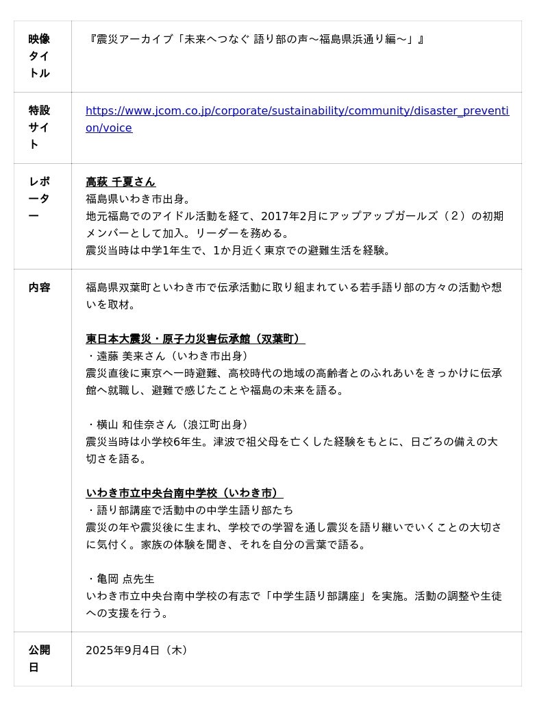 JCOM株式会社(J:COM、本社:東京都千代田区、代表取締役社長:岩木 陽一)は、震災から得た教訓や経験を、地域の防災・減災に繋げるべく、伝承映像『震災アーカイブ「未来へつなぐ 語り部の声」』最新作を2025年9月4日(木)より特設サイトにて無料公開します。本作は東日本大震災の伝承を行う語り部の中でも若年層に焦点を当てた映像です。福島県いわき市出身でアイドルグループ「アップアップガールズ(2)」の高萩 千夏さんが案内役として語り部の皆さまに会いに行き、共に言葉を紡ぎます。