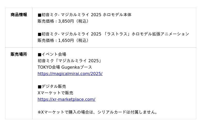 初音ミク「マジカルミライ 2025」TOKYO会場のGugenkaブース内で、新発売商品と既存商品を含めたホロモデル商品を販売いたします。