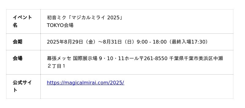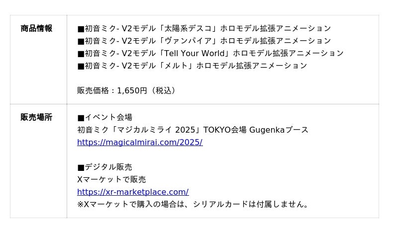 株式会社Gugenka(代表取締役CEO 三上昌史)は、2025年8月29日(金)~8月31日(日)に幕張メッセで開催される『初音ミク「マジカルミライ 2025」』TOKYO会場にて、デジタルフィギュア「ホロモデル」の出展・ブース内販売を実施いたします。