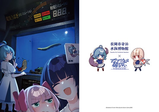 さらにクリアファイルのデザインを初公開! 寺泊水族博物館に遊びに来たスーズたちが、ゲームのワンシーンのモデルにもなっているデンキウナギの水槽の前で記念撮影をしています。