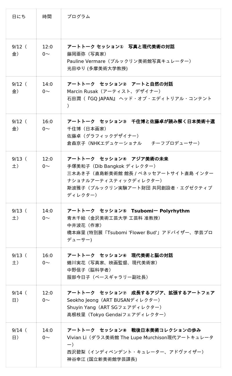 2025年は、日本全国で文化活動が活発になる重要な時期かつ、芸術の秋の訪れでもある9月に開催時期を変更することで、国内におけるアート・エコシステムにおける役割を強化すると同時に、国内外の企業・芸術文化機関との新たなコラボレーションやパートナーシップを導入し、日本の確立されたギャラリーシーンに更なる可能性を広げ、他にはない文化交流の新たな機会を提供します。